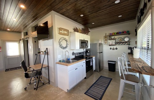 A unique Get Away with Family and Friends. Close to A & M, Round Top, and several Local Wineries. Rent one cabin on this property or several. Each Cabin has its own outdoor space and charcoal grill. This cabin has a tranquil outdoor area sharing a firepit with the cabin next door. Your dogs are welcome. There is a fenced in yard with this Cabin..