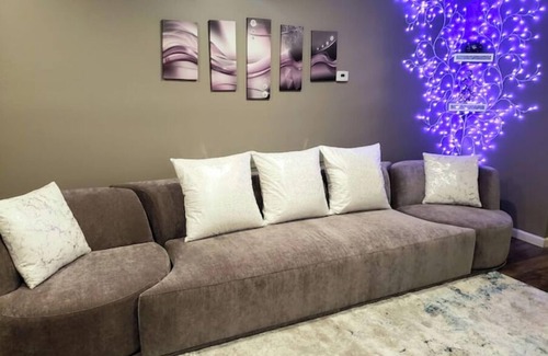 huge 1575 foot, 3 bedroom 15 bath townhome. Extra large livingroom boasts a beautiful super long dusk designer couch with swivel chairs at each end. An additional swivel chair & oversized ottoman in the adjacent corner.