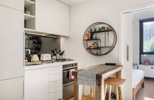 the compact kitchen comes fully equipped for your holiday catering with an oven, stove and dishwasher for easy clean up You’ll also find some of the city’s best restaurants and bars within a short walk away. There’s a hightop dining table as well as a proper desk and chair for those needing to set up their laptop.