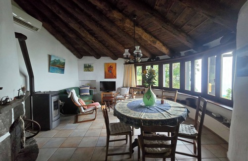 inside, casa cappellina presents a spacious open-plan living arrangement, suffused with natural light thanks to numerous windows, all equipped with privacy shades The living room features tiled floors and is furnished with a comfortable sofa corner, armchair, dining area, and an open fireplace that invites for cozy evenings. The open kitchen, accessible directly from the living area, is fully equipped with a ceramic stove, electric oven, refrigerator with freezer compartment, full cookware, tableware, dish towels, and all essential utensils for self-catering.