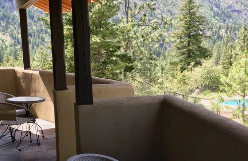 a separate sitting area with a fireplace and a comfy loveseat is just right for curling up with a good book French doors lead to your balcony with views of the surrounding mountains and valleys. Continue along a path that will take you to our beautiful outdoor pool (open from June through September).