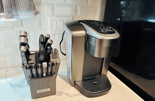kitchen has all essentials including, stove, oven, microwave, freezer/fridge, toaster, kuerig coffee maker, cooking utensils, pots, pans and salt and pepper!