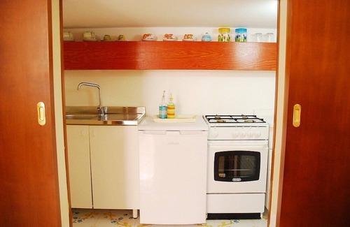 you will be able to enter the third bedroom from the patio going down ten steps The floor is paved with characteristic majolica tiles. The furnishings are simple. The room has a matrimonial bed (160 cm/63 inches, wider than a queen-size bed), that can be split into twins if requested (please contact our staff in advance to make arrangements). The furnishings include a divan that unfolds into a double bed. There is also a cooking area. The kitchenette can be closed in a cupboard and is equipped with a four-burner gas cooker, an electric oven, a small refrigerator without freezer and an Italian-style coffee-maker. There is a table that can accommodate two guests. In this room you will find a satellite television (local channels). The room has a high window, and it's equipped with an air conditioning/heating unit. This bedroom has an en-suite bathroom, decorated with majolica tiles and equipped with a washbasin, a toilet, a fully enclosed shower and a hairdryer.