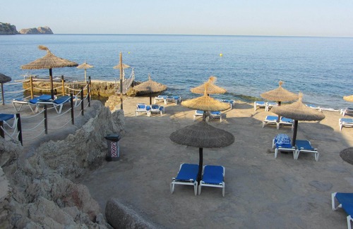 casa suerte is located in costa de la calma, an idyllic village on the southwest coast of majorca, between santa ponsa and peguera Genial is the proximity to Palma, 15 km or 15 minutes by car. But also the luxury ports of Portals Nous and Puerto Andraxt are only a stone's throw away. Beautiful bays can be found 300 meters away. The main beach of Santa Ponsa is 1 km away. The studio is for two people and very complete. t and privately equipped The studio has 30 square meters, living room, kitchen and bathroom. A heater ensures on cool days for your well-being. Stereo system and satellite TV are available and you can of course use our wireless internet. The terraces are equipped with table and chairs, sun loungers and parasol. In the evening, the garden is well lit and invites you to linger. Supermarket, bakery, restaurants, doctors, pharmacy and hospital are within walking distance. So a car is not required..