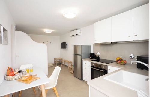 Cavo Blue Villa is a beautiful 4 bedroom villa 120 m2, in a complex of 5 villas, with a big communal swimming pool. The view from the terrace is fantastic, enjoying every aspect of Mykonos, from sea and mountain up to pool view. The villa is located near the beautiful and famous sandy beach of Elia.