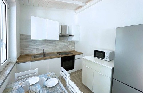 three-room apartment with sea view, sleeps 4+1 (max child 10 years old), with independent entrance Located on the first floor of a small building (no elevator), it consists of a living room with TV and a queen-size sofa bed. Kitchenette with induction hob and column fridge. Double bedroom. Twin bedroom with skylight. Bathroom with shower. Large terrace with sea view equipped with dining table and 2 sun loungers.