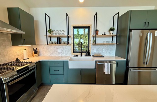 our large kitchen island serves as the natural gathering spot, equipped with a fully-stocked kitchen that makes meal preparation easy Whether you're brewing morning coffee while taking in those stunning lake views or preparing hearty après-ski dinners after a day on the mountain, this space brings people together in the most natural way.