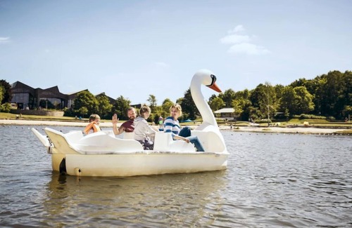 Child friendly resort "Center Parcs Park Bostalsee". Outside the resort, 10 km from the centre of Nohfelden, on a slope, on the lake, on the beach, in the countryside, in the woods. For shared use: indoor pool heated. Shower/WC in the pool area, children's pool, slide, hot tub, tennis (extra), basketball, volleyball court, beach volleyball, children's playground. In the complex: reception, restaurant, bar, breakfast room, sauna (extra). Massage (extra). Spa area (extra) table tennis, billiard table, trampoline, shopping facilities, bicycle rental. Available: bowling (extra). Breakfast possible (extra). Central parking spaces. Railway station "Türkismühle" 7 km. Golf course (9 hole) 8 km. Nearby attractions: Nahequelle mit Wildfreigehege, Sternenwarte Peterberg, Strasse der Skulpturen. Please note: car-free holiday complex. The owner does not accept any youth groups. Fishing [permit required] (extra). Loading and unloading of baggage is possible at the holiday house. The photograph shows a typical example. All houses/apartments are individually designed/furnished. The holiday park with terraced houses in timber construction (some with lake view) is located directly on the 120 ha large reservoir "Bostalsee", a paradise for swimmers, sailors and windsurfers. The focal point of the complex is the covered "Market Dome" with various restaurants, panoramic terrace overlooking the beach and lake, shops, House of Games and the children's activity program "Wannabe". In the subtropical water paradise "Aqua Mundo" (free of charge) with indoor and outdoor pools, slides (up to 130 m) and wave pool nothing to be desired. Sports arena, archery, mini golf, pony riding and boules are other parts of the extensive recreational activities. Facilities partly extra. Pedal and electric boat rental (extra).