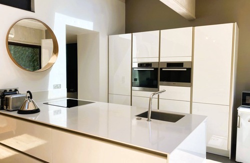 - large, bright, air-conditioned living space with lounge, dining area, and kitchen (induction hob, refrigerator/freezer, oven, microwave, steam oven, nespresso coffee maker, kettle, dishwasher) opening onto the terrace and pool