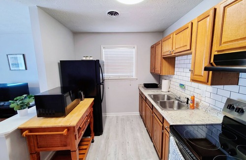 the apartment building is located in a well-lit and safe area with exterior doors that stay locked Avoid expensive parking near campus/downtown by utilizing the off-street parking spaces provided behind the building for guests only. (One space per bedroom booked) A few minutes' walk will put you at the nearest bus stop where you can utilize public transportation to traverse across Lexington. When it's time to drive out to explore all the scenic and beautiful locations across Kentucky like the Gorge or Mammoth Cave, your vehicle will be waiting for you there safely. Don't forget about the Bourbon Trail! Once you're ready to relax and unwind, you'll find that the apartment is equipped with all the conveniences you need to recharge in comfort. A large flat screen smart TV is there for your convenience. Utilize your favorite streaming services to catch up on your favorite programs while lounging on the couch. Rest easy knowing that each apartment has adjustable AC/heat and each room is equipped with blackout shades and a box fan which is useful for white noise. Night owls and early risers will also appreciate the coffee maker located in the full kitchen. Whether you plan to eat out and dine at local restaurants or prepare your own meals, you'll be set during your stay. It would be our pleasure to provide any recommendations and tips during your stay. feel free to reach out to us anytime!