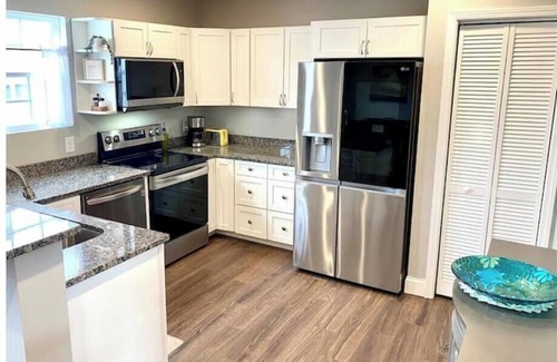 the home is new construction (2023) and has been curated with new and vintage pieces for a comfortable and streamlined home away from home The space is equipped and ready for longer stays. Fully furnished kitchen makes cooking convenient. Each bedroom has a closet and blackout curtains to control lighting. Sleeps 5 total.
