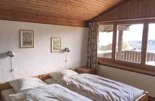 the smaller bedroom with a view of the flimserstein has two single beds, the larger south bedroom has two single beds and a cabin bed