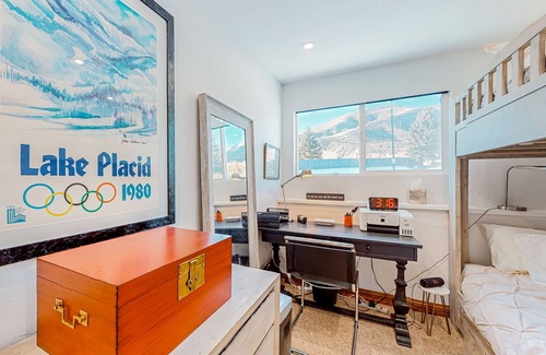 the condo's interior amenities extend into the home office, great for wfh situations, and to the separate ski closet As the stars begin to fill the night sky, tuck under the soft linens available in both of the bedrooms. rest, dream, and repeat another day amongst the mountains!