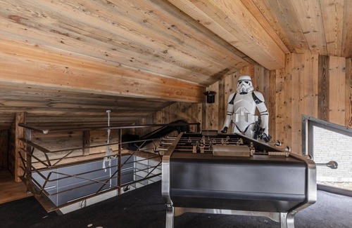 The Banksy Tribute luxury chalet is located in Tignes les Brévières. Authentic, in wood and stone, it reveals an extravagant place under its roof. Here Banksy, the eponymous artist in the spotlight, is omnipresent through his works and his so British eccentricity. Its large harmonious volumes are distributed in such a way as to provide everyone with a pleasant space conducive to creativity. Top-of-the-range amenities and services provide you with well-being and relaxation. Its colorfully colored living room where the armchairs take on a serious facelift opens with its large bay windows onto a breathtaking view of Tignes. Its 4 bedrooms are available in the inimitable style of the artist, and each draws its inspiration from one of his favorite cities. Surrounded by memories of pop culture, you will find furniture with eccentric shapes perfectly integrated into a universe of luxurious comfort. There is also an outdoor jacuzzi for you to relax after a day of skiing. The ski slopes are 50 m away, the resort center is 600 m away. Surface area : about 350 m². View mountain OR View street. Living room with fireplace. 4 bedrooms with double bed, bathroom, hairdryer, WC. with kettle, coffee machine, oven, hood, dishwasher, microwave, 2 cooking rings, fridge. Separated WC. Balcony OR Terrace..