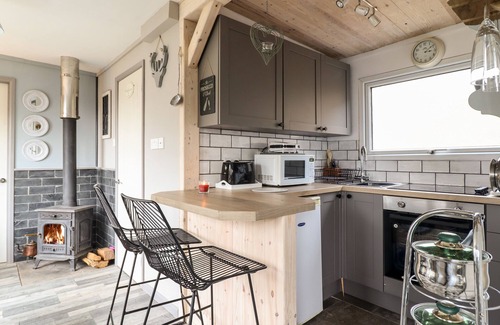 amenities: electric wall heaters Electric oven and hob, microwave, fridge, kettle, toaster, toastie maker. Fuel, power, and starter pack for woodburning stove inc. in rent. Bed linen and towels inc. in rent. Travel cot available on request..Off-road parking for 1 car. Garden with decking and furniture. One well-behaved dog welcome. Sorry, no smoking. Shop 3 miles, pub 2.6 miles. Note: Step up into the chalet. Note: This property has a Good Housekeeping Bond of £150. Water is from a natural source and is tested safe. Whilst work is being done on the site bottled water is provided to ensure further safety for drinking.