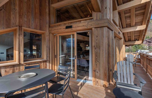 a 256m² family chalet combining traditional and contemporary features, with 5 bedrooms for 14 people, including an independent studio