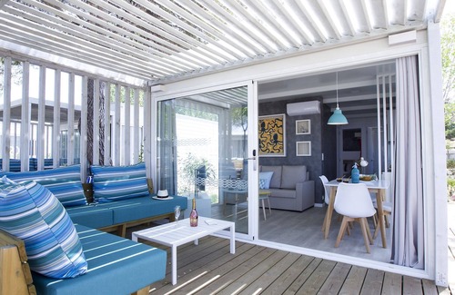 This 5-pers. chalet has two bedrooms, one with a double bed and one with two 1-pers. beds and a 1-pers. high sleeper. These chalets were built in 2020 and have air conditioning, an open kitchen with dishwasher and microwave and a bathroom with shower and toilet. You have a (covered) terrace/veranda and there is parking for one car. For an extra car you pay € 12 per night on the spot.