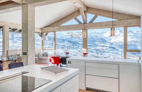 this exceptional mountain rental features 5 bedrooms including a dormitory, a huge living room with large open kitchen, central fireplace and reading corner, a spacious terrace, a sleek, modern lounge and large picture windows offering spectacular mountain views