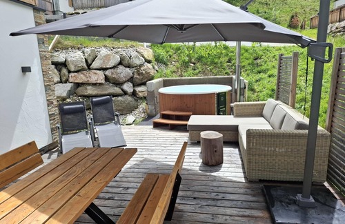 the chalet offers a spacious living room with modern open-plan kitchen, accessed via an elegant black steel door Get cosy on the terrace with picnic benches, lounge, sunbeds, parasol, bbq and wood-fired hot tub to enjoy yourself. There is a luxury sauna downstairs with double rain shower for ultimate relaxation after a day in the mountains. the accommodation offers parking for 3 cars and there are public e-chargers in the village