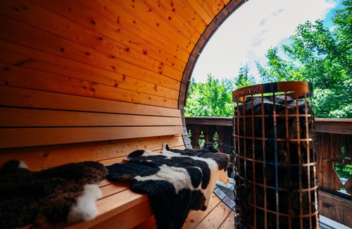 a special highlight of the gams suite is the private outdoor area Here, guests can expect a hot pot and a traditional barrel sauna – an exclusive wellness oasis under the open sky. Surrounded by the silence of nature, with a view of the majestic mountain backdrop, a unique feeling of tranquillity and relaxation is created. Whether after a hike through the Karwendel or an active winter day in Seefeld – Tyrol's high plateau: In the Gams Suite, nature experience, alpine luxury, and comfort merge into an unforgettable stay. It is the perfect choice for couples seeking a romantic and at the same time stylish retreat in the Tyrolean Alps..