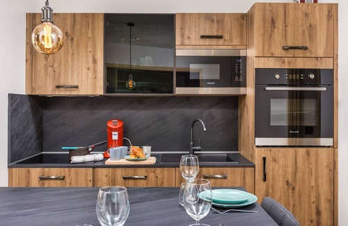 the apartment has a contemporary alpine décor, with modern furniture and wooden accents There is a comfortable sitting room, with wooden and stone panelling and a double sofa in front of a large, flatscreen TV and a glass door that leads onto the balcony. The separate kitchen/dining room is attractively decorated in with a stone table and 4 raised dining chairs. The well-equipped kitchen has with an induction hob, oven, microwave, dishwasher, fridge and coffee machine.