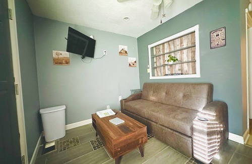inside: enjoy the entire guest suite apartment with private entry via a convenient keypad check-in The suite includes a comfortable living space, a bedroom with a queen-size bed, a futon, a full bath, a mini fridge, a microwave, a coffee maker, a TV, and internet access. There is no kitchen.