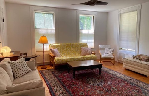Spacious 1 BR apartment in a 4-unit historic Victorian mansion, built in the 1880s by the family after whom the street was named. Sunny & bright fall/winter, cool & shady spring/summer. Wood floors throughout! Queen bed in BR, living room w/ queen futon couch + full sleeper sofa (curtains provide privacy from the rest of the space). 10 minutes from I-91, 20-25 minutes from Greenfield, Amherst, Northampton & Berkshire East. High speed internet and cell service with AT&T (Verizon is unreliable).