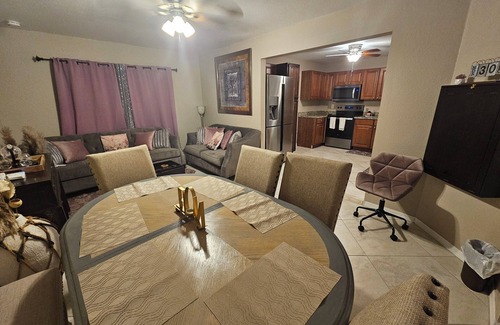 Spacious 2-bedroom, 1-bathroom home. This charming single-family property offers an open floor with ample natural light, modern finishes, and a comfortable beds. Great for families, business trips and traveling nurses. With plenty of space for everyone, a workspace with fold-out wall mounted computer desk, high speed Wi-Fi, our home is perfect for anyone looking to make lasting memories. Enjoy a fully equipped kitchen, a large backyard for playtime. come create unforgettable moments together!
