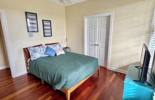 outdoors: large front porch with rocking chairs Large back porch with 8 person dining table and shade umbrella. Lounge chairs. Hot tub. Screened in porch with sofa and chairs. Large deck on the pond for lounging, fishing, or sunbathing. Fire pit with Adirondack chairs.