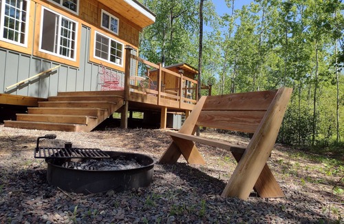 enjoy serene north woods seclusion just two and a half miles from grand marais! at the end of a foot path you'll find yourself at this charming off-grid cabin set in the forests of the lake superior bluff This quaint cabin is filled with windows bringing views of the surrounding woods. It features a polished/rustic interior complete with well equipped kitchen, comfortable beds, and wood stove. The hammocks, deck, campfire, and path to the nearby Fall river invite guests outside to explore!.