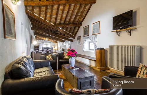 An 18th century VENETIAN STILE VILLA on the west side of Lake Garda, facing the small harbour of Toscolano Maderno. The apartment, on the third floor of the main building serviced by an elevator, is very big: 2 double and 1 triple bedrooms, a separate kitchen, 2 fully-equipped bathrooms with shower and a large area with dining and living space. This apartment has air conditioning and heating (free of charge). Soulér 2 has free access to the house historical garden, surrounded on three sides by the lake, where tables, chairs and sun beds are available. A nice BBQ is also available in the garden. The garden has to be shared with other guests of different apartments in the same house..