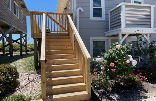 a fully operational kitchen is available for those who want to just stay home and cook/grill and enjoy the ocean breeze while sitting on the back deck! sunsets are not to be missed! no need to leave as you'll have everything you need when you arrive at 'lil seabiscuit'! beach chairs/towels are available for your stay along with some beach toys Fire pit available, Adirondack chairs, loungers, outdoor dining on deck, you will be able to appreciate the sight, smell and feel of mother nature. however, if you don't feel like cooking there are plenty of amazing restaurants (even in walking distance!) to explore!