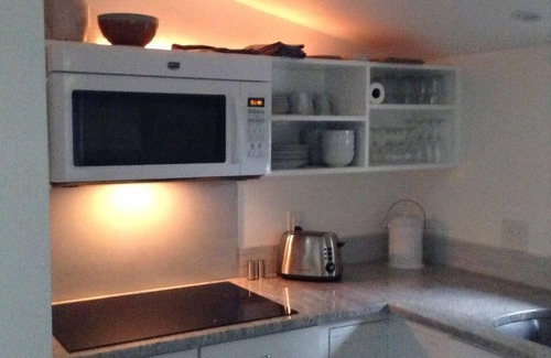 the modern kitchen is fully equipped, complete with kashmir white granite counter tops, induction range, microwave/convection oven, two stage water filter, coffeemaker, toaster, cordless auto shut-off glass water kettle, dishwasher and under-counter refrigerator