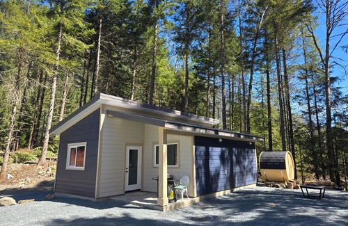 surrounded by serene forest, it features rustic outdoors with modern comforts Enjoy evenings by the fire, mornings on the porch, and relaxing sauna sessions. Ideal for couples or small families seeking peace and nature.