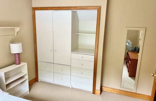 upstairs you'll find three spacious bedrooms all with new bedding and pillows The primary bedroom hosts a king size bed and large built-ins. The second bedroom has a queen bed and built-in closet with hangers and plenty of drawers. The third bedroom has a double bed, and same built-in closet. Completing this level is a bathroom with two marble-top vanities, toilet, large walk-in shower and deep standalone bathtub. Shampoo, conditioner, body wash, and brand new towels are provided.