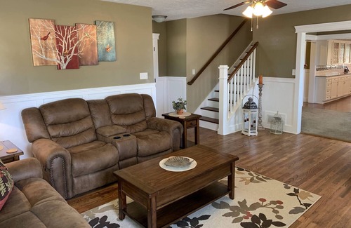 the kitchen is stocked with cookware and high-quality appliances so you'll feel as though you are at home in your own kitchen A large farm table allows large numbers to gather together and enjoy a meal, play games, and relax and talk about the memories made with family and friends. The home's open floor plan provides plenty of room to enjoy family and friends. The family room and sitting room are comfortable and inviting and make it easy to relax after a full day of adventure and fun.