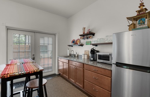 the guesthouse cottage has a kitchenette with refrigerator, toaster oven, microwave and a keurig machine for your morning coffee The guesthouse is not ventilated so no cooking is allowed nor do we allow guests to bring their own cooking appliances. You'll want to spend time inside or outside in the lovely courtyard with a cup of coffee or a glass of wine and your favorite book, phone, or computer during your down time. You will enjoy high speed internet/ wifi and a smart TV for your entertainment in the living room and bedroom. There is a security camera that monitors outdoor common spaces only. It monitors activity in the driveway area and courtyard.