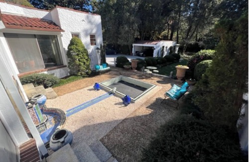 enjoy this one-level, mediterranean style home located on a peaceful and secluded property, featuring a stunning high-beamed living room, an updated and well equipped kitchen, formal dining room, cozy breakfast room, spacious sunporch and expansive outdoor space including a private courtyard with outdoor seating The sunporch and courtyard are perfect for sunny mornings and enjoyable evenings. There is also a naturally landscaped fish pond original to the home. The large driveway offers plenty of parking. This is a whole house rental. The expansive living room is very comfortable with lots of seating, the dining room comfortably seats 6 and breakfast room seats 4. The home offers much space to enjoy family and/or colleagues.
