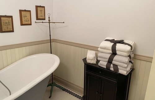 the bathroom is clean and well-appointed with a claw-foot tub with shower attachment, fluffy towels, and complimentary toiletries