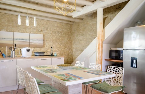 Come and discover the Ile de Ré in our charming exposed stone house of 90m2, classified by Charente Maritime Tourism, full of charm with its dry stone walls and exposed beams, combining authenticity and modern comfort, nestled in the calm of a flowery alley . Tree-lined terrace, enclosed by walls, facing south, out of sight to take your meals in peace! Lovely views of the village rooftops from the bedrooms and the church tower. You will enjoy the beautiful living room of 45m2 With its open kitchen and its old fireplace overlooking the 25m2 terrace sunny all day and not overlooked. In large armchairs or on a comfortable bench you will watch television or DVDs!You will enjoy the decoration in the spirit of typical Retai village houses by making a good chimney fire in winter!Upstairs you will stay in 2 bedrooms (a 140cm bed for L one, two 90cm beds for the other bedroom and outside AL an independent annex will be made available with another bedroom including a 140cm bed and an additional shower) .A small lounge is available with a sofa bed upstairs that can serve as extra sleeping for a child. Bike room in the courtyard with access to the alley, possibility to park the car to unload easily in front of the door, parking spaces in the alley or on the public car park at 25 M. Comfort and charm guaranteed for a quiet but close holiday bike paths, the largest market and 5 minutes from the Gollandières!Bikes available and baby equipment also (cot ...) Do not hesitate!!!!.