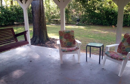 the large back yard is a great place to catch up on your favorite book The patio also has an Old Florida patio swing, perfect for enjoying a glass of iced tea and relaxing to the sounds of the birds and rustling leaves.