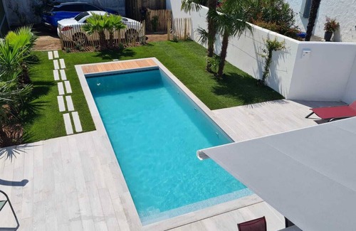 the wooded and enclosed outdoor area includes a 60m² terrace, a 3x8m heated swimming pool (may to september), a wooded garden and parking spaces for 2 large cars