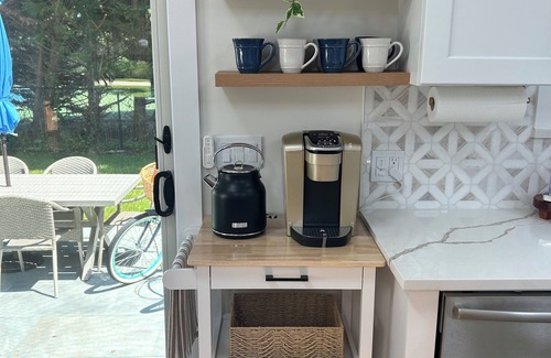 indulge yourself in all the modern amenities of a high-end hotel with privacy, your own home and no crowds! when you arrive, you are welcomed in by bright vaulted beamed ceilings with skylights, a quartz and new marble kitchen, an original stone gas fireplace and cozy plush bedrooms all with tv’s and adjustable base beds Once inside you’ll find - A/C, internet, stocked eat-in-kitchen, coffee/tea bar, designer linens, washer/dryer, sliding doors to the fully furnished stone patio with gas grill, smoker, dining table and couch seating with a fire pit table. Perfect for entertaining and family enjoyment! In the yard shed you’ll find beach chairs, cooler and two bicycles for your summer enjoyment.