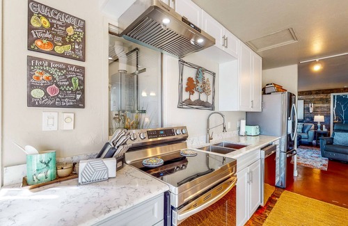 walking into your retreat, you will instantly be charmed by the custom-painted walls, bright pops of color, and cozy furnishings Boasting open floor plan living at its best, enjoy cooking in the full-service kitchen where gleaming countertops, stainless steel appliances, and a coffee bar await. The adjacent living room comes complete with a large TV and easy sunroom access. Find yourself sipping on your morning cups of coffee and sifting through your vacation read in this space.