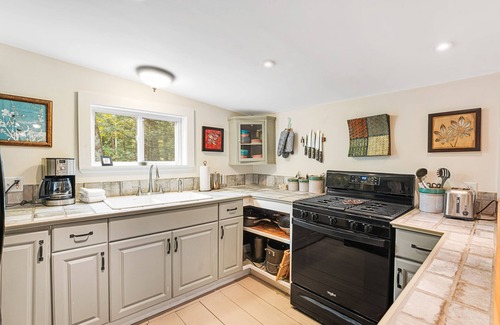 indulge in a secluded getaway to the rolling hills of dover and slip right into relaxation mode as soon as you walk into this charming cabin Featuring wide-plank floors and an open layout, this comfy mountain home has all of the nostalgic feels of a rustic cabin. A babbling brook passes by the backyard, making the setting even more serene. After full days of skiing nearby, unthaw with a cup of hot cocoa in hand. When mealtimes come around, there will be no delay in whipping up a tasty recipe with ease, as the full kitchen boasts a beautiful gas range, modern appliances, and plenty of counter space to prep any ingredients. Not to mention, the flatscreen TV and free WiFi can come in handy for entertaining the whole gang as the stars come out.