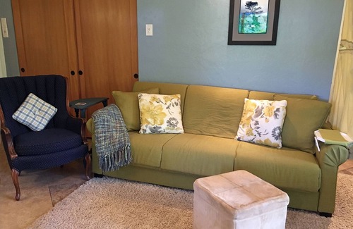 • the country guest house includes free wi-fi and parking, a flat-screen satellite tv, movies and dvd player, a sofa, a dining table and chairs, a 14’ closet, a queen size bed, etc It sleeps 1 or 2 people. The 440 square foot guest house includes a private bathroom and a fully stocked kitchen. Just outside the French door, guests enjoy a quiet and private patio with a bistro table and chairs overlooking the garden, a private picnic table, an outdoor sofa, and a hammock along with all of the amenities of the property.
