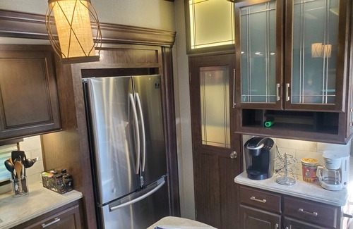 all very clean and safe! modern rv with all inclusive amenities Upscale park. Designed for 2 people but sofa has a hide-a-bed for 2 more. Dishwasher, 2nd W/D, WIFI. Includes outside gazebo w/table and chairs and ceiling. Outside TV. Shed includes A/C, Washer/Dryer, shower/Toilet Golf cart included..
