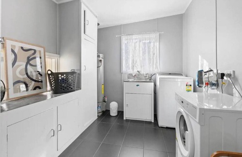 a modern bathroom offers a spacious shower, while the separate internal laundry includes a washing machine and dryer for added convenience