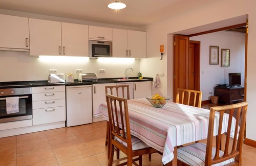 loja da lenha has comfortable ground floor accommodation for 2 guests The entrance opens into a well-furnished living room which features original chestnut beams, one stone wall and a coffee table locally crafted from beams used in the Quinta. There is a sofa, 2 armchairs, TV with over 600 cable channels, including German satellite channels, broadband access and table lamps for reading. Beyond, the kitchen/diner has table/chairs for 4, an electric hob, oven, dishwasher, microwave, fridge, toaster, and kettle and plenty of serving/cooking equipment.