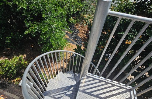 there is a spiral staircase leading up to the 2nd floor There are flood lights if you come in at night that will illuminate your path..